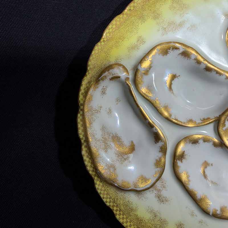 Yellow is the color of this beautiful 5 well Oyster plate. Many sellers price this plate much higher than we do because of the color, but our prices are always very competitive in this market as we have a wide range of customers all over. Measuring 8" across, the plate is lined in gold plus around each well. A very collectable item! Marked twice on the back with one mark indicating the manufacturer H & C and the other the retail outlet in Philadelphia, PA (Wright, Tyndall & VanRoden). A true win for any collection!