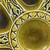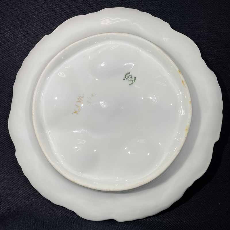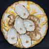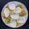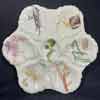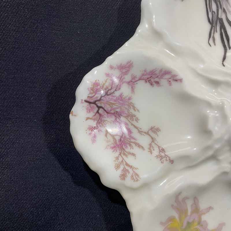 UPW (Union Porcelain Works) was the first company in the United States to manufacture Oyster plates. Located in Greenpoint, NY, they make Oyster plates in 4 well and 6 well kidney shaped Oyster plates as well as round Oyster plates. They come in a variety of colors but this one is magnificent! The background is in soft-white in the wells with loads of seaweed and sea-life between each of the wells. It has 6 wells and a center sause well and is tan along the outer rim trimmed in gold. It's marked on the back with their logo and Pat Feb. 4 79' standing for 1879! Men and women both normally agree on a UPW plate as a standard for a collection! Like all of our Oyster plates, there are no flaws, chips or cracks.