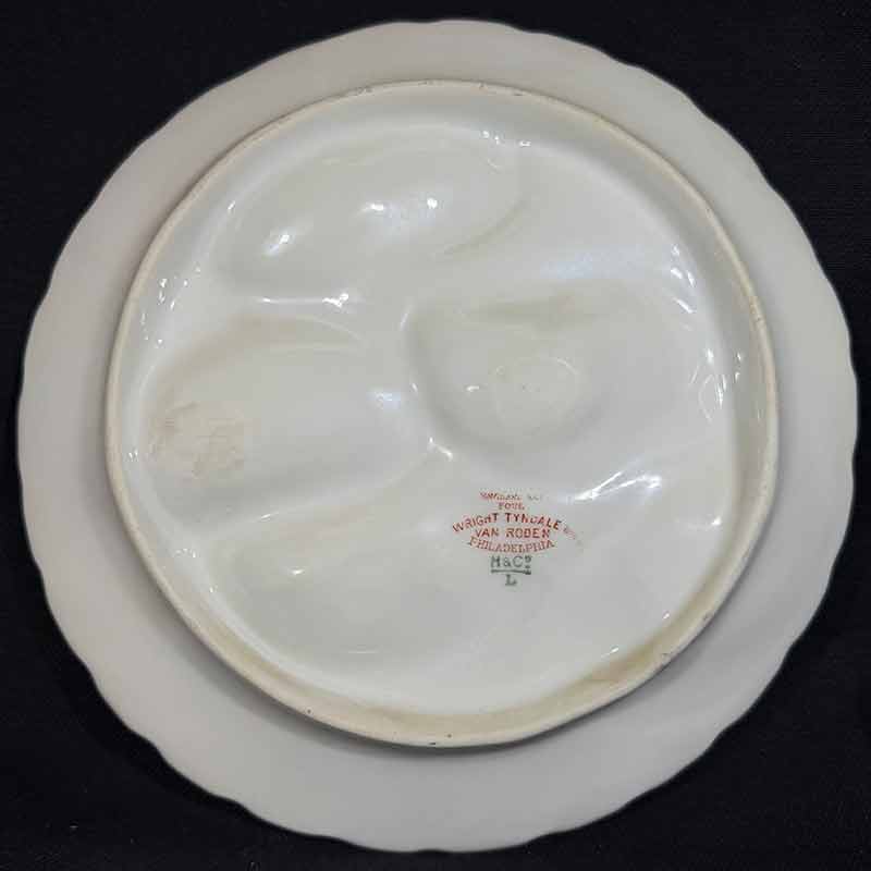 Yellow is the color of this beautiful 5 well Oyster plate. Many sellers price this plate much higher than we do because of the color, but our prices are always very competitive in this market as we have a wide range of customers all over. Measuring 8" across, the plate is lined in gold plus around each well. A very collectable item! Marked twice on the back with one mark indicating the manufacturer H & C and the other the retail outlet in Philadelphia, PA (Wright, Tyndall & VanRoden). A true win for any collection!